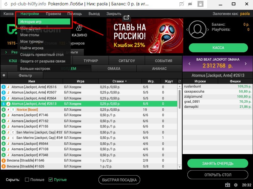 Вы можете отследить свою стату на SharkScope или же воспользоваться возможностями клиентской программы рума. Для этого следует перейти в историю покерных игр. Она доступна игроку в любое время. В ней можно будет увидеть количество турниров, которые вы успели отыграть в этой комнате, количество сыгранных рук в обычных раздачах, уровень винрейта. Чтобы перейти в историю игр, выполните следующие шаги: