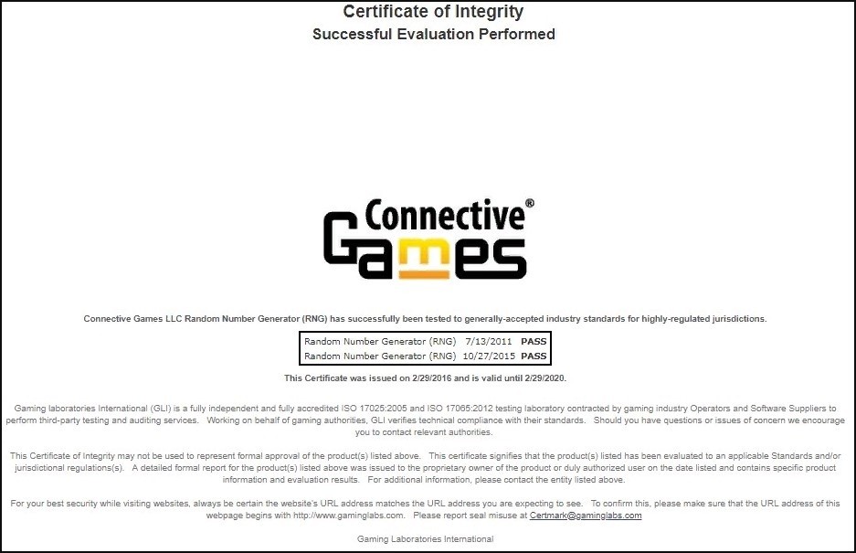 ПокерДом – это лицензированное игорное заведение. А значит, можно быть уверенным в его надежности. Сомневаться в честном игровом процессе тоже не стоит – ГСЧ этого казино сертифицирован авторитетной лабораторией Connective Games LLC: