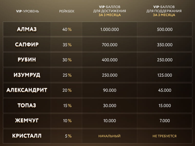 ВИП-статус покеристу присваивается после регистрации. Сначала игрок находится на уровне Кристалл и получает 5% рейкбека. Статус действует в течение 3 месяцев. Если покерист набирает за квартальный период от 10 000 и более поинтов, то переходит на ступень выше и получает больший рейкбек исходя из таблицы: